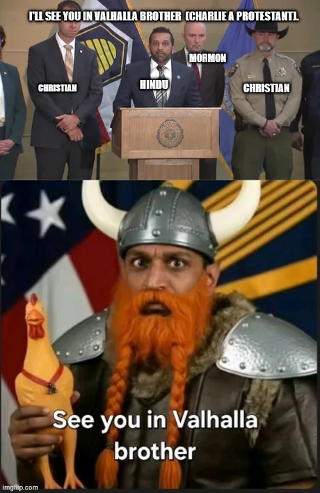 Eins vorweg. Religion ist heilig und jeder so, wie er mag. Aber auf der Beerdigung von Charlie Kirk, seines Zeichens evangalikaler Christ, hat Kash Patel (selber wohl Hindu) vor Tausenden Jesus-Fans gesagt. âWir sehen uns in Walhalla, Bro.â Vollkommen klar, dass die Memes dazu nicht lange auf sich warten lassen.